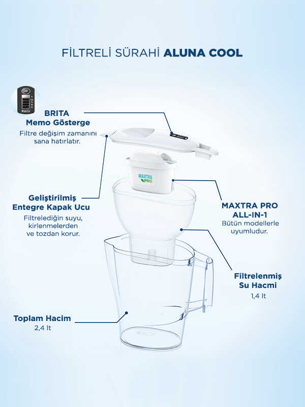 - Aluna Cool Kapasitesi: 2,4 lt Toplam Hacim (1,4 lt filtrelenmiş su)