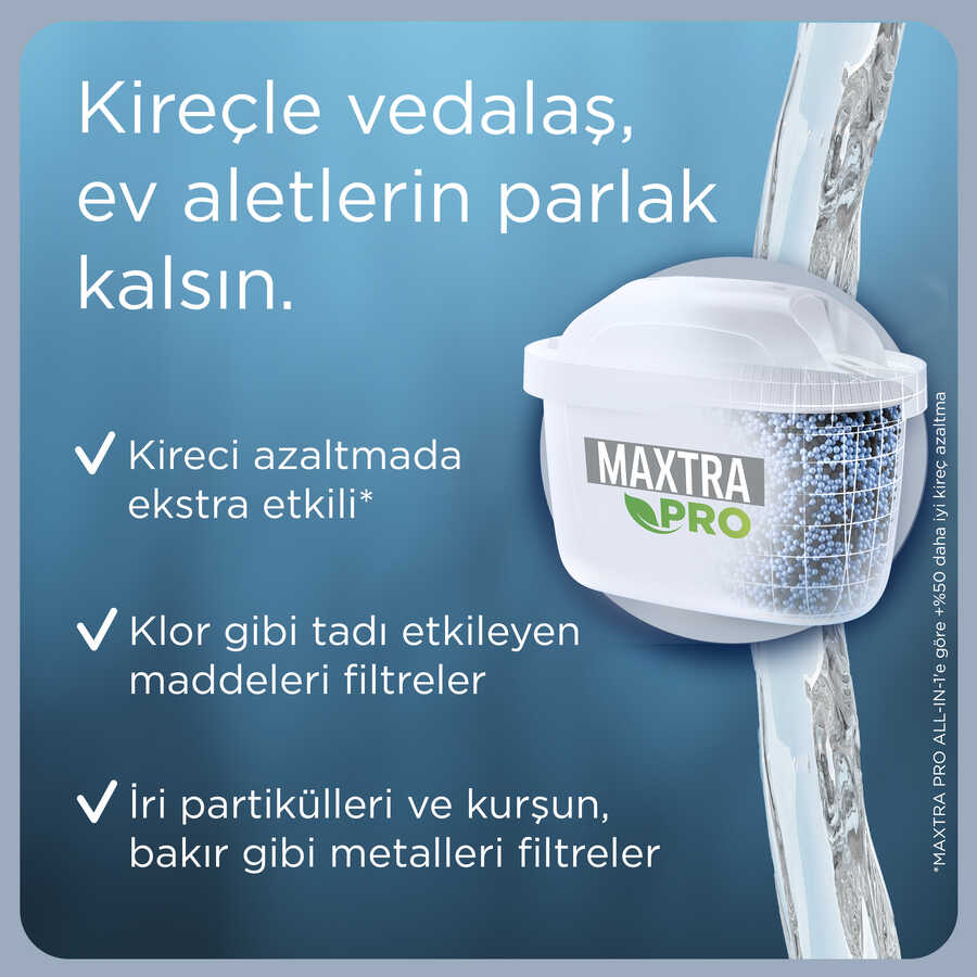 - Küçük ev aletlerini kireçlenmeye karşı güvenilir bir şekilde korur; MAXTRA PRO ALL-IN-1 su filtresine kıyasla kireci %50 daha etkili bir şekilde filtreler.